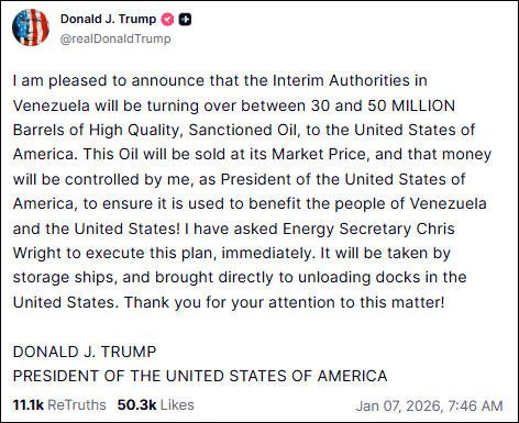 “我荣幸地宣布,委内瑞拉临时权力机构将向美国移交3000万至5000万桶受制裁的高品质原油。”特朗普6日在“真相社交”平台上写道。